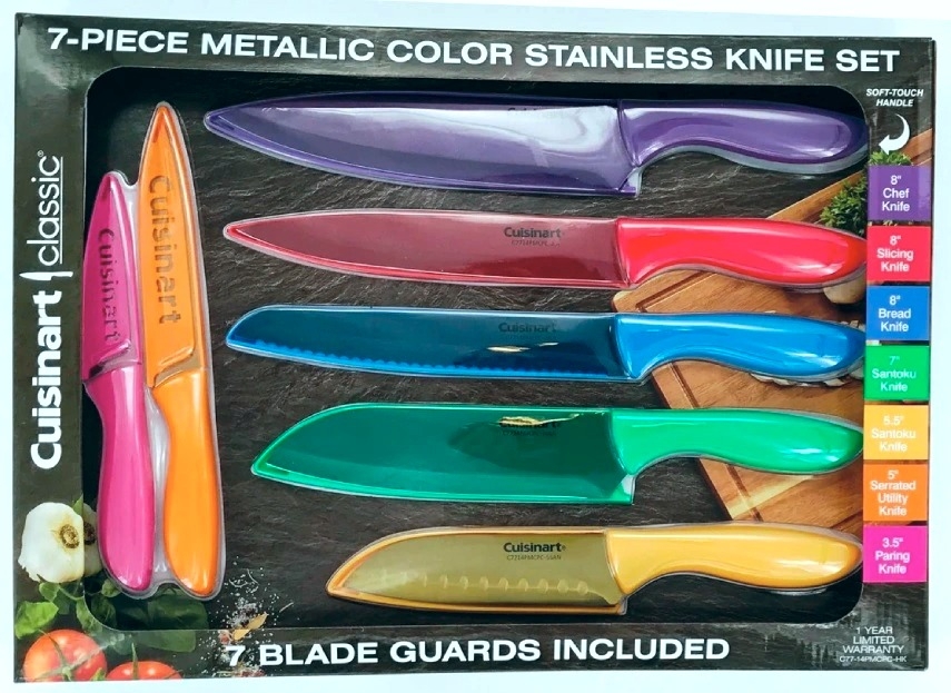 Bộ dao bao gồm 7 loại dao với màu sắc riêng biệt và đi kèm là các bộ bảo vệ dao cho mỗi chiếc dao, bao gồm: